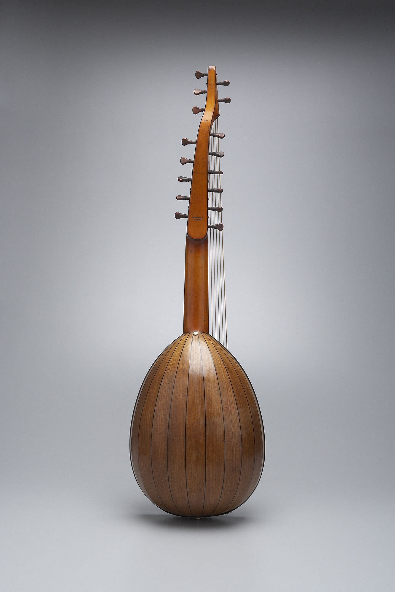 The piriform body is comprised of eleven ribs of sycamore separated by narrow bands of holly. Neck and pegbox are of maple. Table of spruce with floral painted border and parchment rose. The main pegbox holds 11 pegs for the stopped strings (4 double-strung courses and 3 single strings); the second pegbox holds 5 pegs for single, unstopped strings.