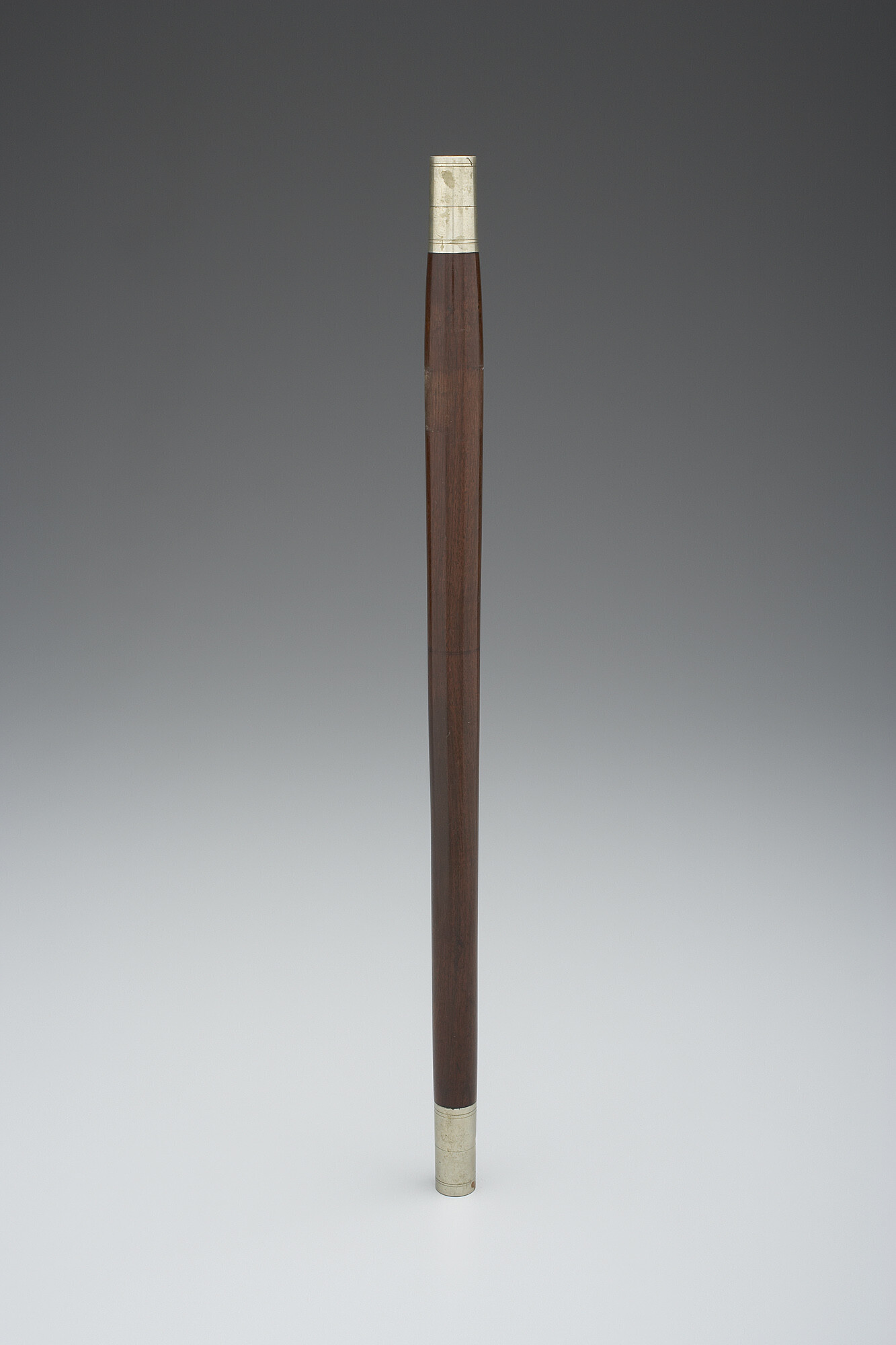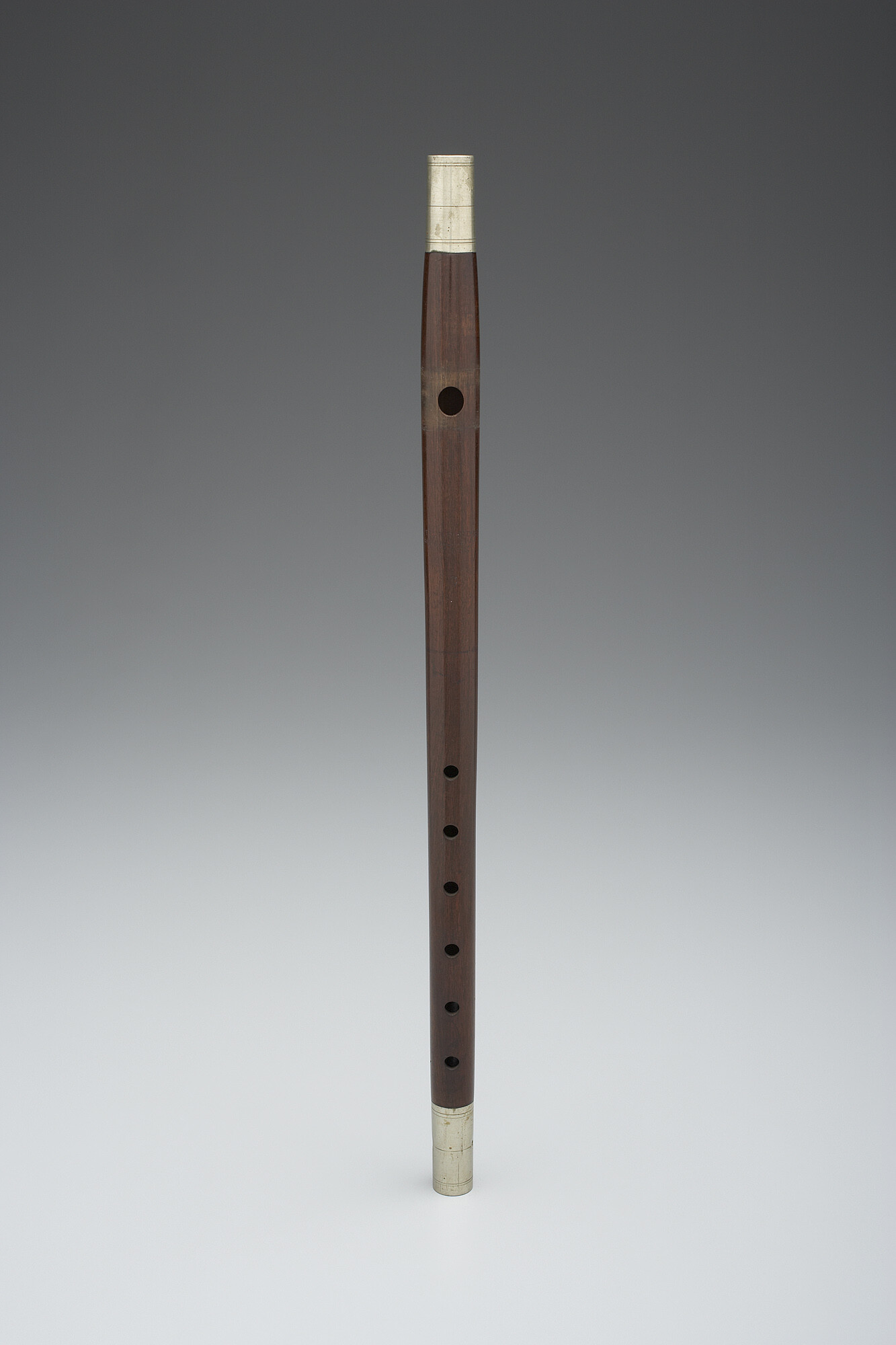Fife in C of rosewood with nickel-silver mounts at either end, an elliptical embouchure hole, and six fingerholes. The ferrules are seamless, both with 2+1+2 scoring. A pewter mouthpiece makes for easy blowing.