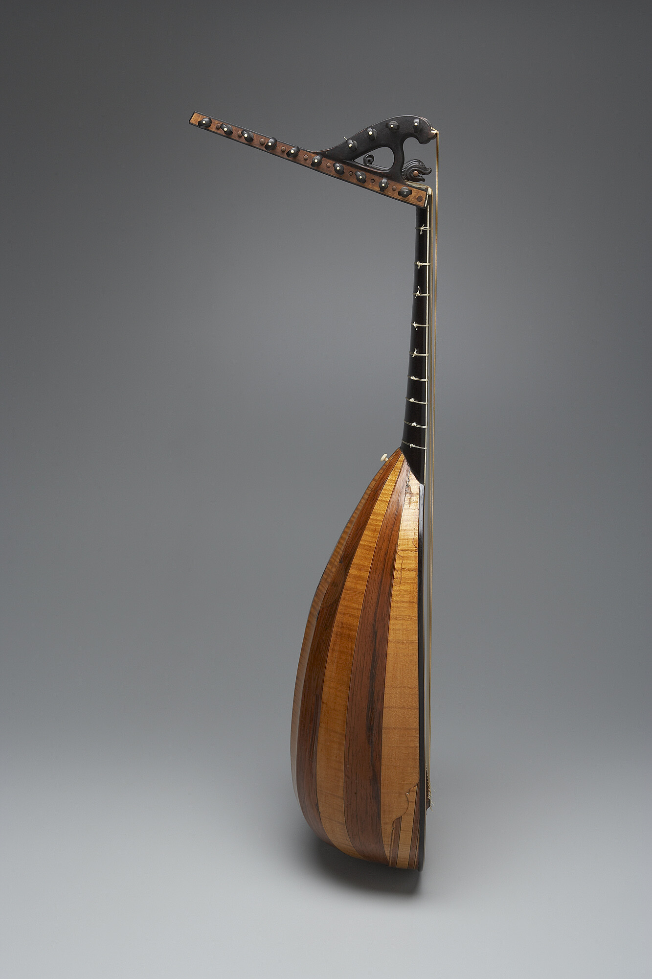 Body of 11 ribs: six of sycamore and five of rosewood, articulated by thin inlaid strings of ebony and an undetermined light-colored hardwood, possibly holly. The two-piece belly is of fine-grained spruce, the grain broadening slightly at the sides. A carved rosette of pearwood is set into the belly. The belly is reinforced by ribs running perpendicular to the grain. The neck is of ebony. The pegbox is veneered with ebony. The instrument is strung with 13 courses of strings: 11 on the main pegbox (9 double courses plus 2 chanterelles) and 2 on a second pegbox, which is glued to the bass side of the main pegbox. The lowest six courses on the main pegbox and the two courses on the second pegbox are tuned in octaves; the lower of each pair of strings is overspun. The tuning peg for the treblemost of the strings (chanterelle) is fitted in a carved dolphin's head glued to the treble side of the main pegbox. The hardwood bridge is veneered with ebony.