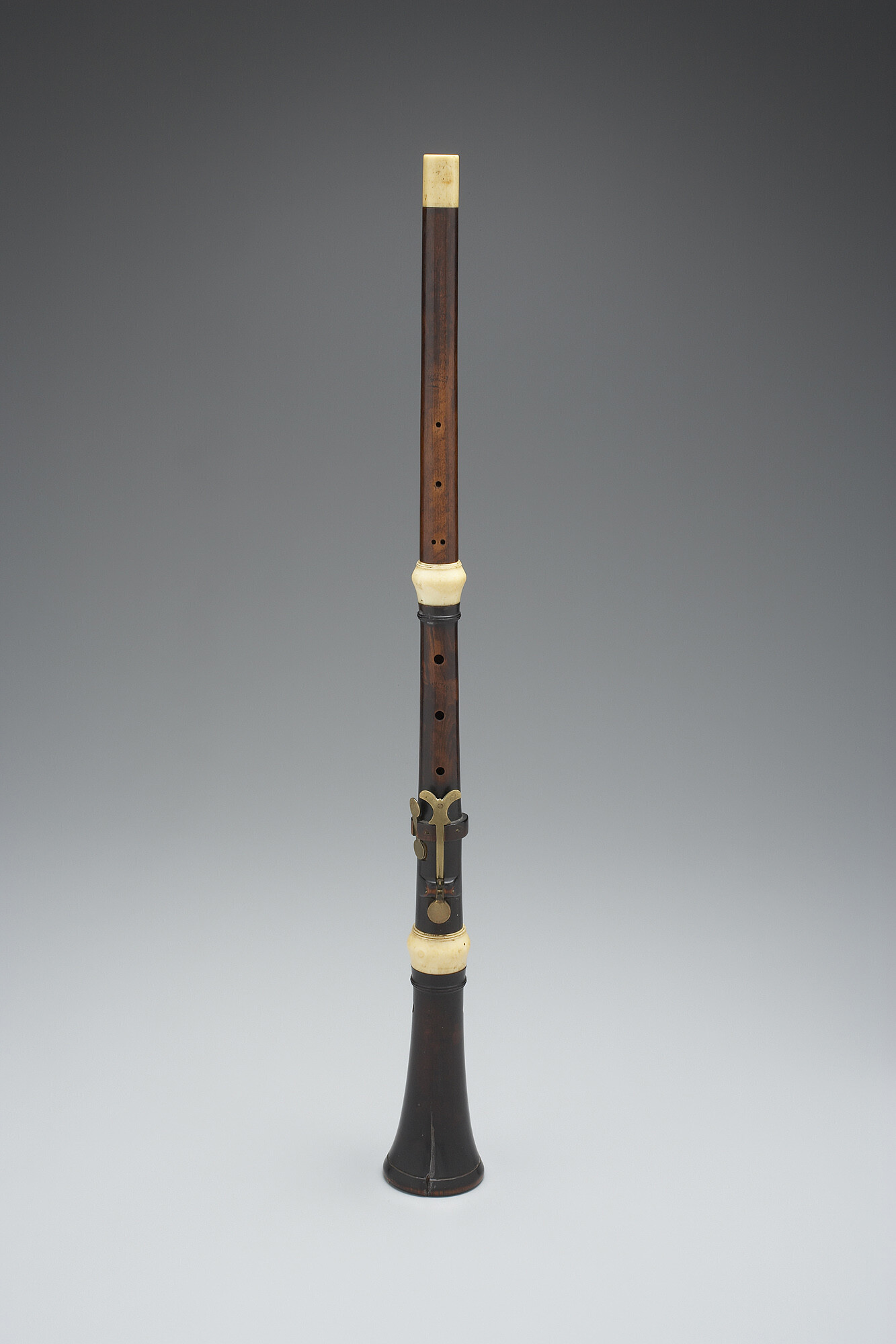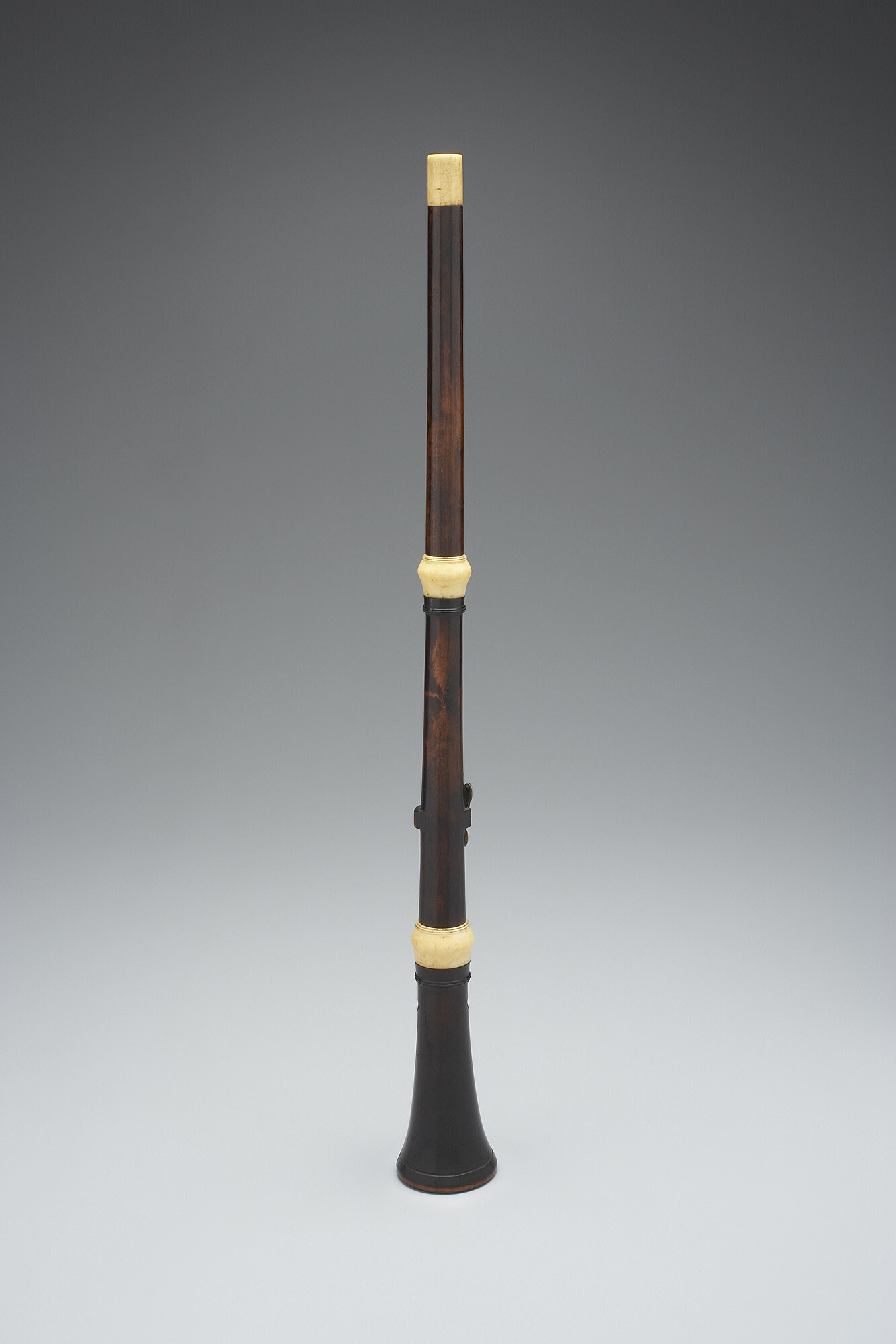 Oboe in three pieces, with ivory rings. Two circular brass keys, one swallowtailed.