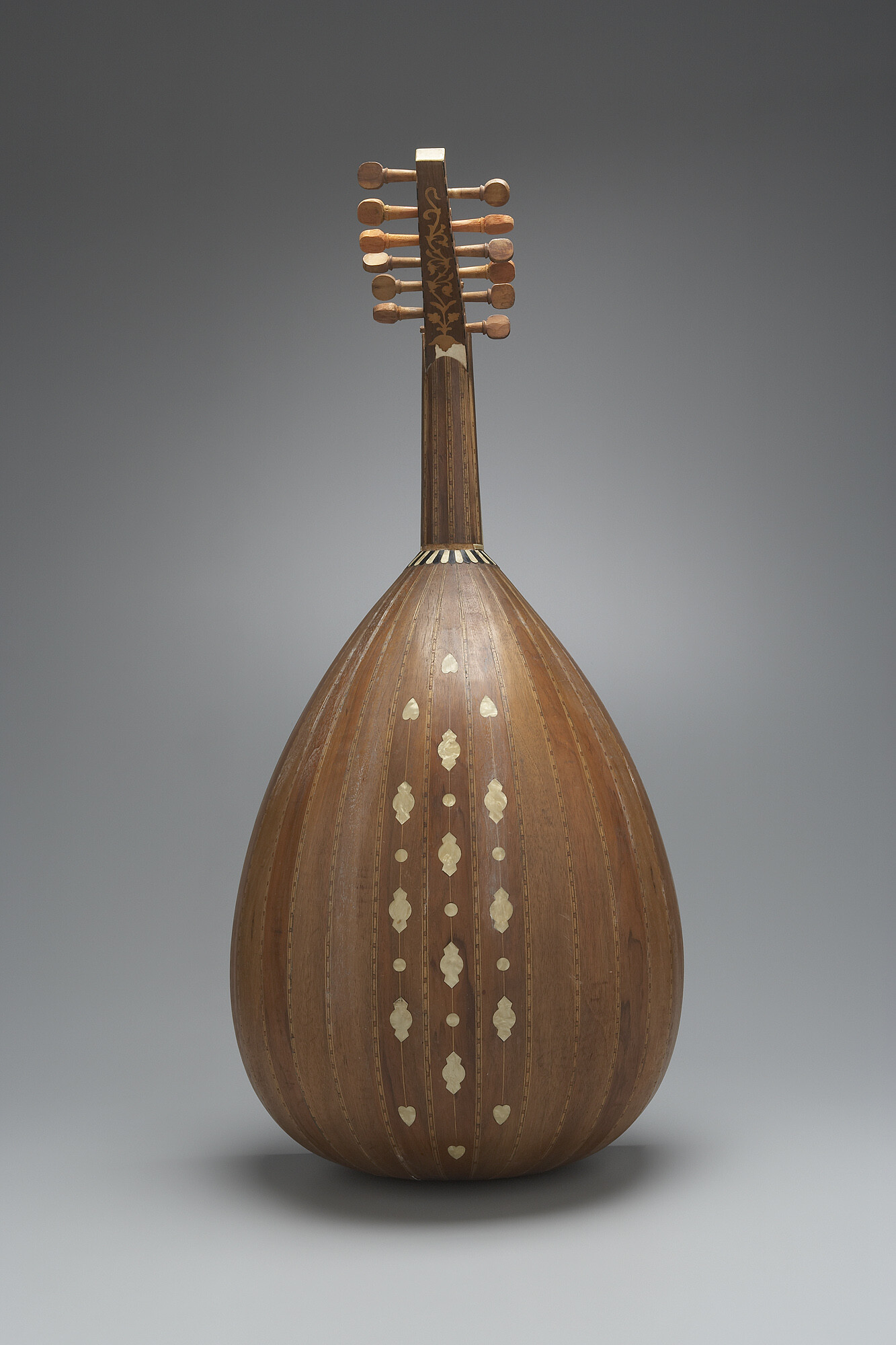 Piriform body made up of 17 hardwood articulated by strips of band inlay. The central three ribs are inlaid with small circles, keys, and hearts of mother-of-pearl. Table of spruce pierced by three sound holes with elaborately carved roses. Fingerboard veneered with bone with arabesque inlay of hardwood. The back of the neck is covered with alternating strips separated with band inlay to match the ribbing of the body. The six double courses (pairs) of gut strings are tightened by 12 pegs.